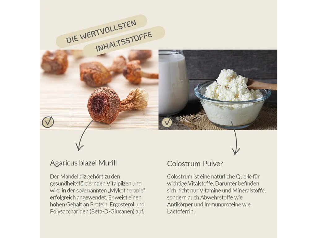 Agalostrum Vital kombinuje na živiny bohaté mlezivo z prvního kravského mléka s léčivou houbou Agaricus blazei Murill. Obsažené bioaktivní látky mohou nutričně přispět k podpoře imunitního systému - ideální pro náročné životní fáze.