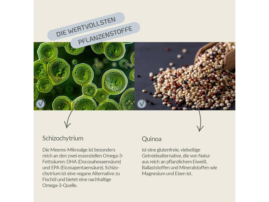 Schizochytrium (omega-3 mastné kyseliny z řas); quinoa; celulóza; řepkový olej (hydrogenovaný)
