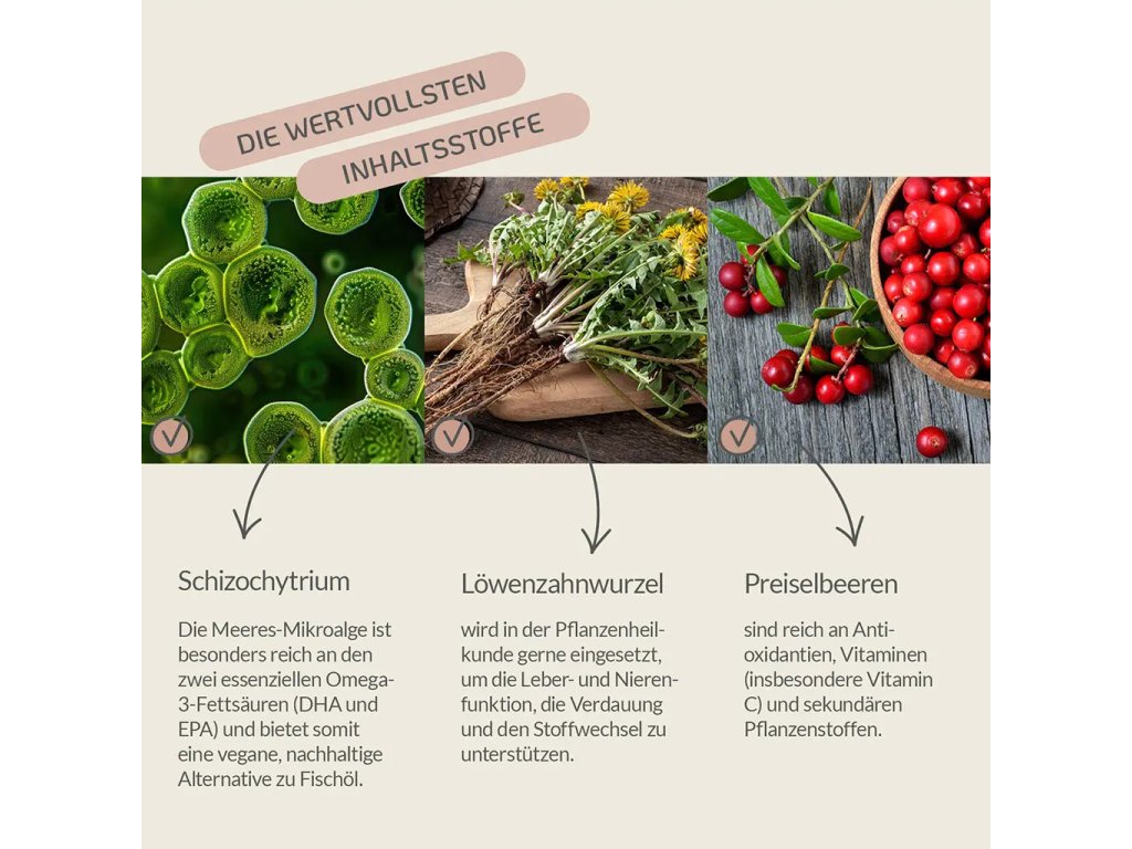 kořen pampelišky; acerola; brusinky; petržel; kurkuma; schizochytrium (omega-3 mastné kyseliny z mikrořas); list břízy; zlatobýl; kopřiva