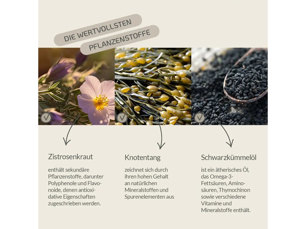 bylina Cistus; celulóza; Ascophyllum nodosum; řasy; řepkový olej (ztužený); olej z černého kmínu.