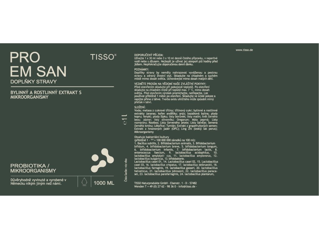 Fermented herbal and plant extract with probiotic bacteria cultures: Pro EM san supplies your intestine with a unique mixture of active lactic acid cultures. Each daily dose contains 30 billion microorganisms from 31 carefully selected strains of bacteria. It also contains 24 fermented herbal and plant extracts.