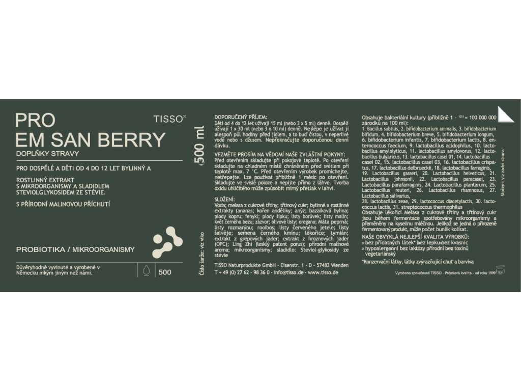 Pro Em San Berry (TISSO renamed Pro Em San Junior to Pro Em San Berry in August 2022) combines the proven ingredients of Pro Em San with a convenient travel size (500ml) and the sweet taste of natural raspberry flavour and stevia extract to make it palatable for kids.
