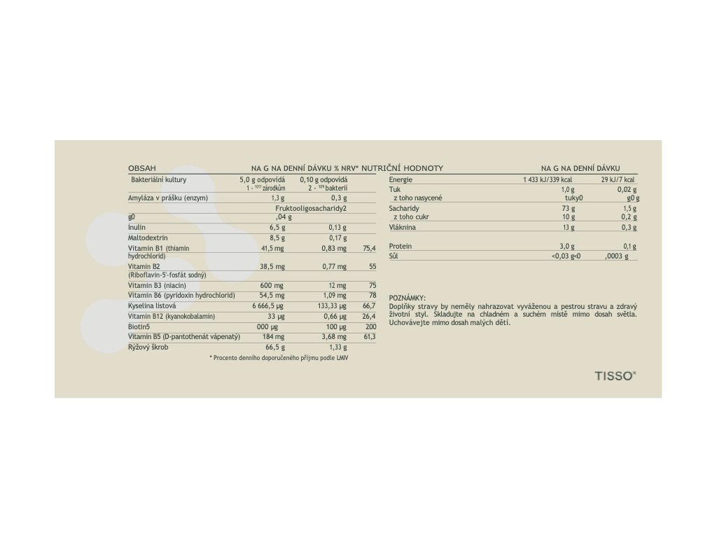 Rice starch (66.7%); maltodextrin (8.3%); inulin (6.7%); potassium chloride; bacterial cultures (5.0%); magnesium sulphate; fructooligosaccharides (2.0%); amylase powder (enzyme); vitamin B3 (niacinamide); vitamin B5 (calcium-D-pantothenate); vitamin B6 (pyridoxine hydrochloride); vitamin B1 (thiamine hydrochloride); vitamin B2 (riboflavin-5‘-phosphate sodium); manganese sulphate; folic acid (pteroylmonoglutamic acid); D-biotin; vitamin B12 (cyanocobalamin)