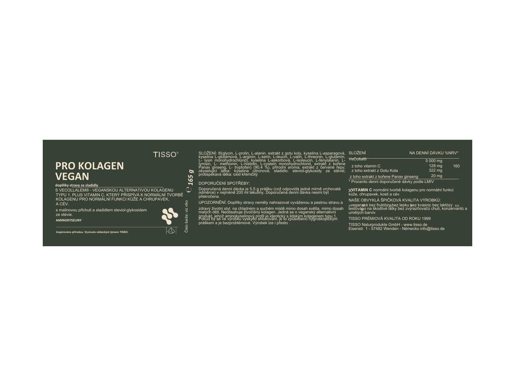 - Special notes: It does not contain any animal collagen. It is a vegan alternative product whose amino acid profile is identical to human type 1 collagen. Should clumping occur in the product, this is due to the hygroscopic powder and is unproblematic. The product can still be consumed.