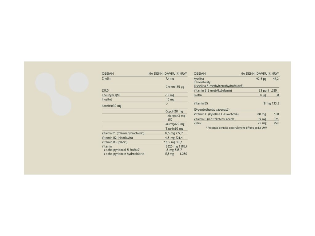 Hořečnaté soli kyseliny citrónové (22,59 %); obal tobolky: hydroxypropylmethyl celulóza st. 0 (HPMC); glukonát zinku (16,97 %); vitamín E (D-alfa-tokoferol-acetát) (11,31 %); vitamín C (7,79 %); L-karnitin-L-tartrát (4,30 %); glukonan manganatý (2,37 %); vitamín B6 (pyridoxin hydrochlorid) (2,07 %); glycin (1,95 %); prášek Mumio; taurin; vitamín B3 (niacin); cholin bitartrát; vitamín B1 (thiamin hydrochlorid); vitamín B6 (pyridoxal-5-fosfát); inositol; vitamín B5 (kalcium-D-pantotenát); vitamín B2 (riboflavin); vitamín B12 (methylkobalamin); koenzym Q10; chlorid chromitý (hexahydrát chloridu); biotin; kyselina listová/folát (5-methyltetrahydrofolát)