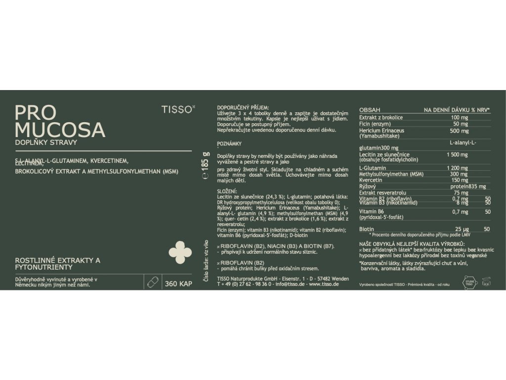 In addition, Pro Mucosa supplies the body with organic sulphur (MSM), quercetin, resveratrol, ficin and sulforaphane from broccoli extract. Also included is the important medicinal fungus Hericium erinaceus.