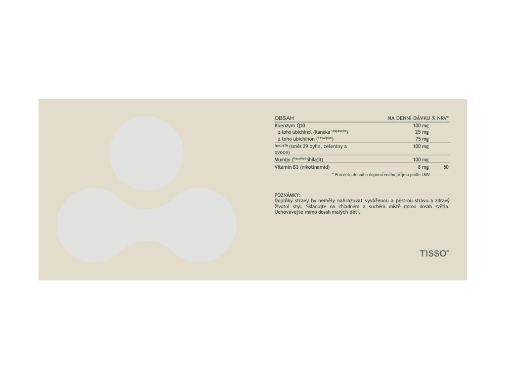 Coenzyme Q10 (CAVAQ10® ubiquinone) (43.1%); pullulan (capsule shell size 0); Spectra™ (Coffea arabica extract, broccoli sprout concentrate, green tea extract, onion extract, apple extract, acerola extract, camu camu concentrate, quercetin, tomato concentrate, broccoli concentrate, acai concentrate, turmeric concentrate, garlic concentrate, basil concentrate, oregano concentrate, cinnamon concentrate, elderberry concentrate, carrot concentrate, mangosteen concentrate, blackcurrant extract, blueberry extract, sweet cherry concentrate, blackberry concentrate, chokeberry concentrate, raspberry concentrate, spinach concentrate, kale concentrate, bilberry extract, Brussels sprout concentrate) (11.5%); Shilajit extract (11.5%); coenzyme Q10 (Kaneka Ubiquinol™) (9.6%); vitamin B3 (nicotinamide)