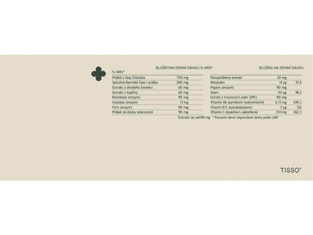 Chlorella algae powder (31.8%); hydroxypropyl methylcellulose (capsule shell size 0); spirulina burma algae powder (12.7%); vitamin C (l-ascorbic acid); bromelain (enzyme); Fig tree sap powder; green-lipped mussel powder; cabbage extract; papain (enzyme); grape seed extract; wild garlic extract (2.5%); stinging nettle extract; dandelion extract; cellulase (enzyme); vitamin B6 (pyridoxine hydrochloride); vitamin B12 (cyanocobalamin); sodium selenate pentahydrate; sodium molybdate dihydrate
