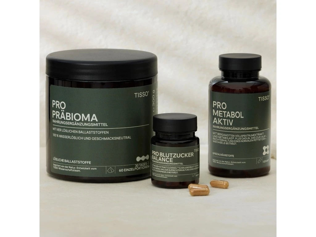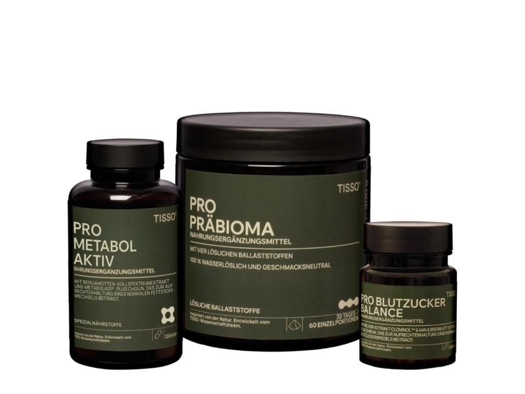 The TISSO weight loss package combines Pro Metabol Aktiv, Pro Blutzucker Balance and Pro Präbioma in a coordinated program designed to support metabolism, blood sugar levels and gut health – three key factors for effective weight management.